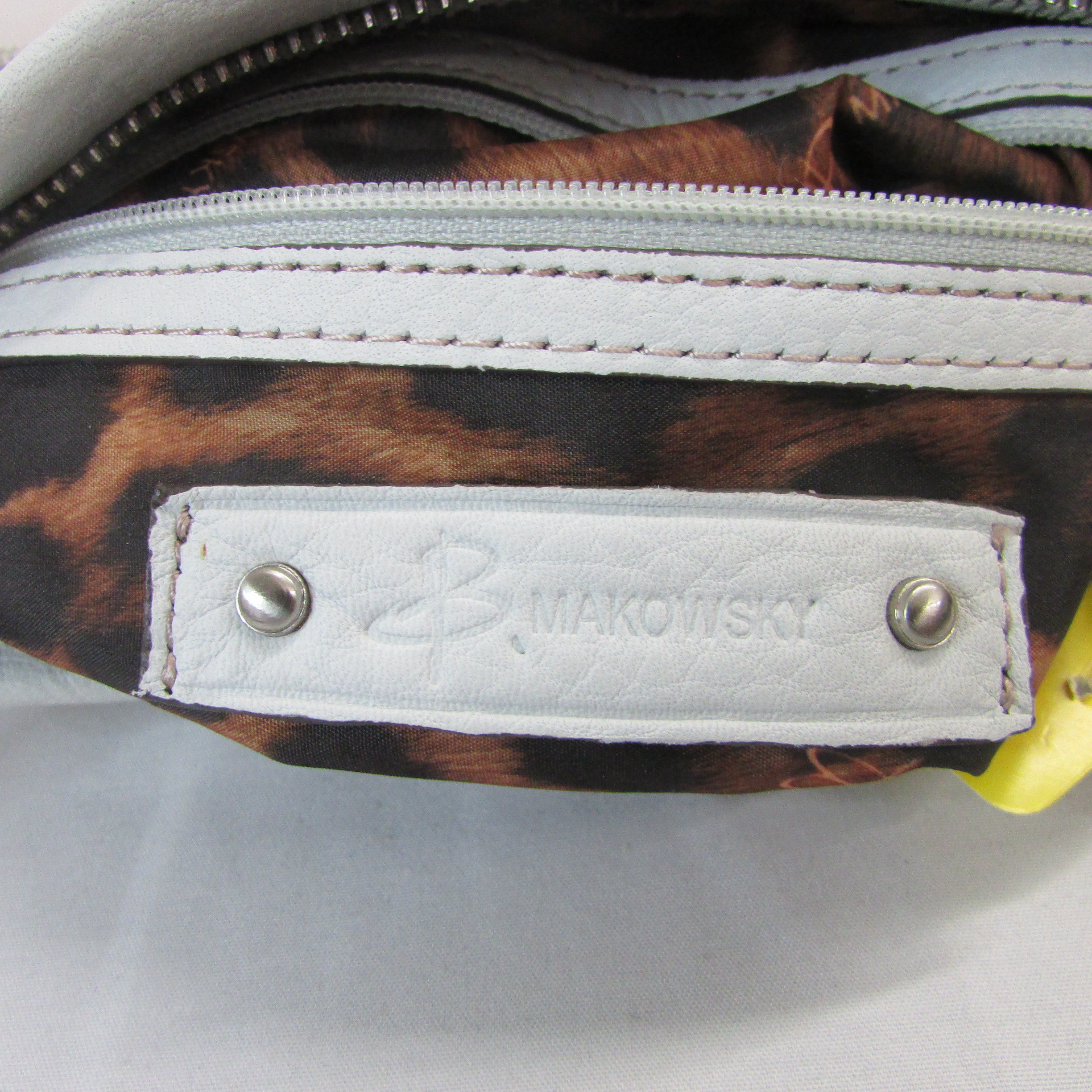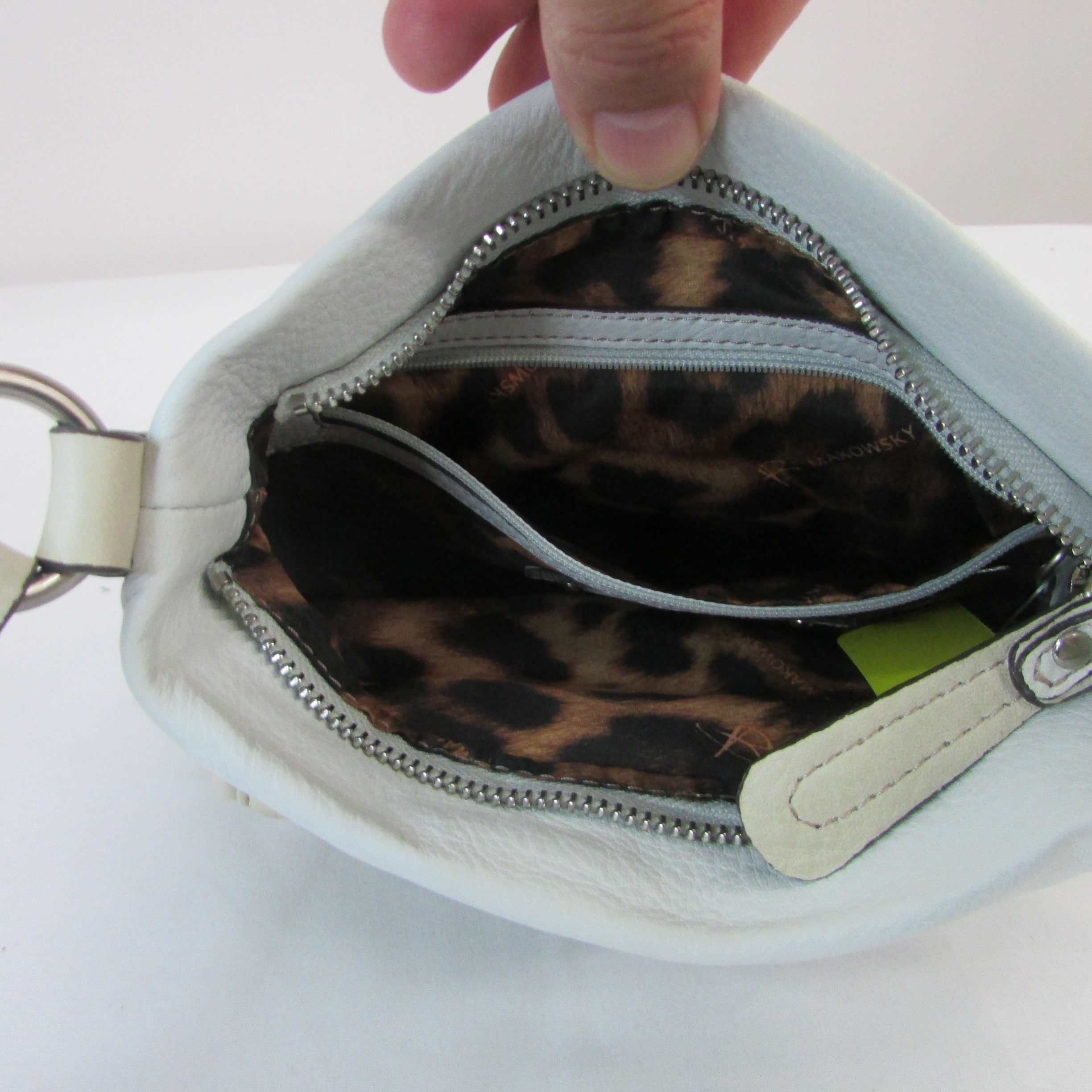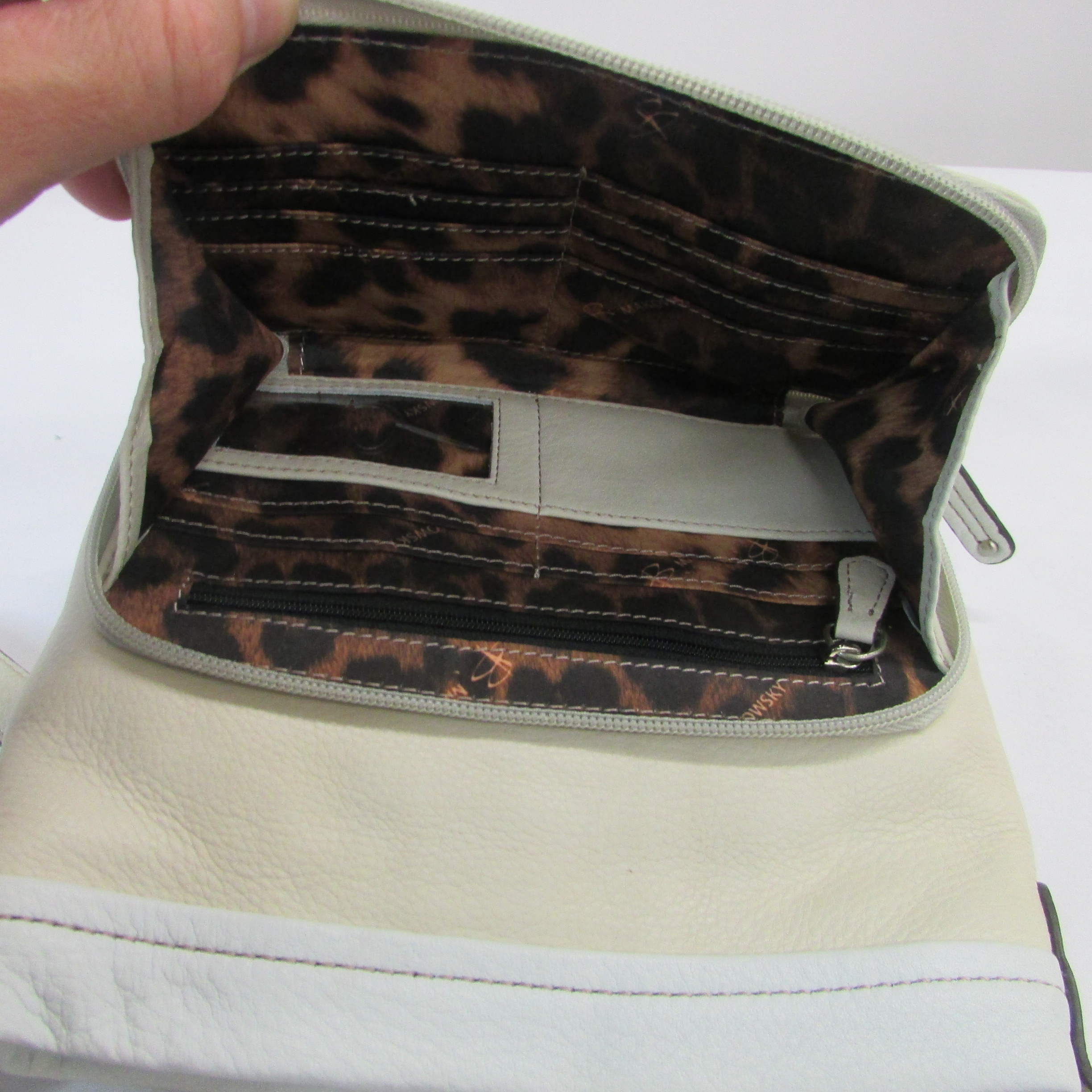Leopard Print Inner w pockets, Outisde flap pocket w large sikver buckle, outside zipper pocket