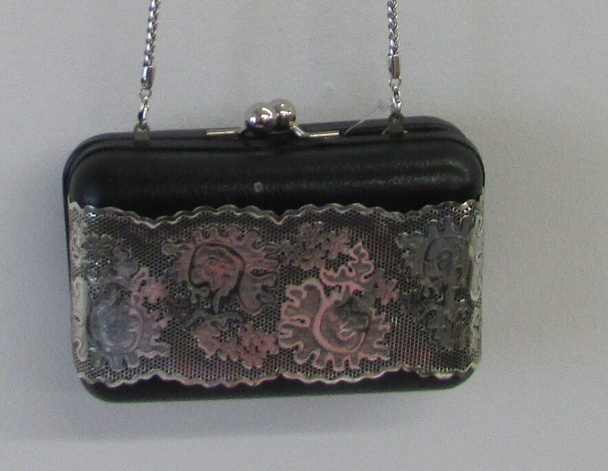 | Kiss Lock Closure Lined w internal pockets Hard case w leather wrap, silver chain link strap Width: 6″ Height: 4″ Depth: 3″ Your satisfaction is our #1 Concern. All our clothing is in good condition, but as most of our clothing is pre-owned, they show normal signs of wear or are in like new condition. We do look over each piece but may inevitably overlook things. If you have received your item(s) and find that there is missing information such as defect, please contact us as soon as possible. |
