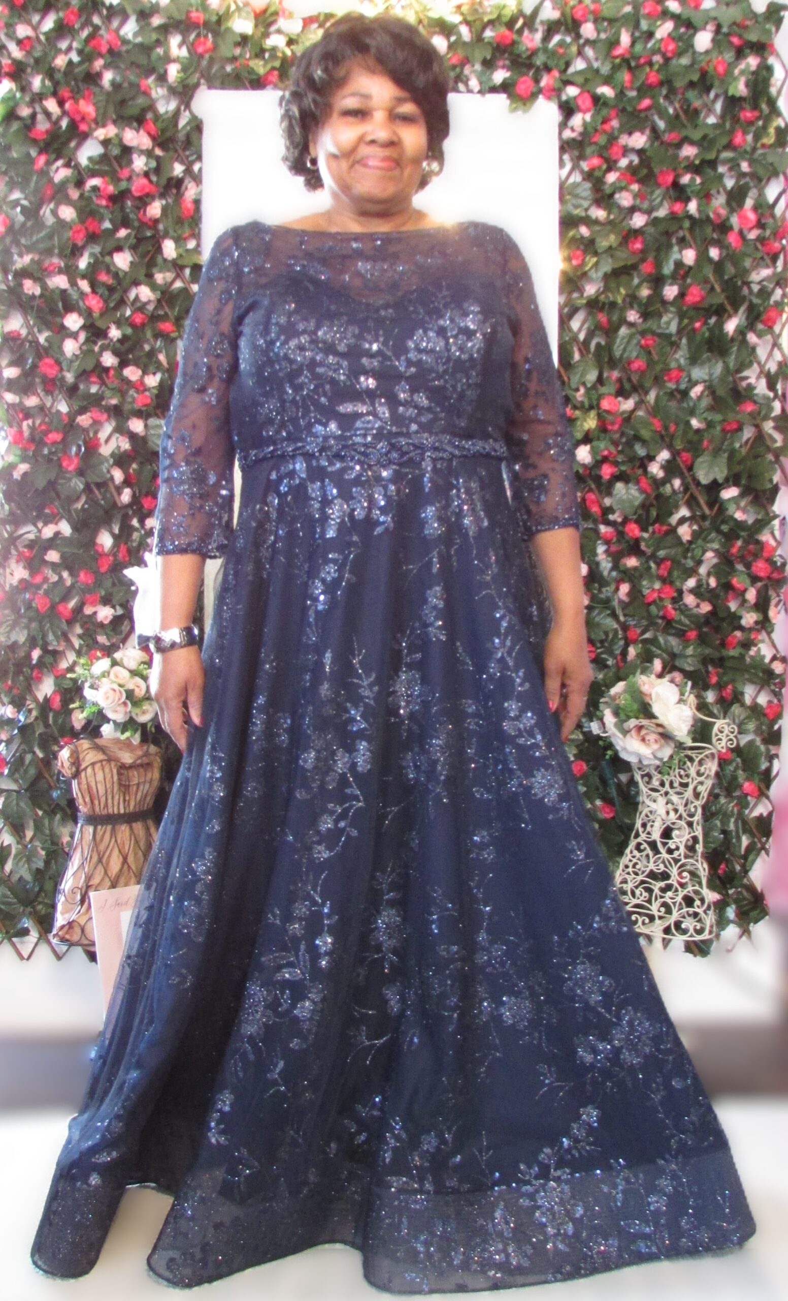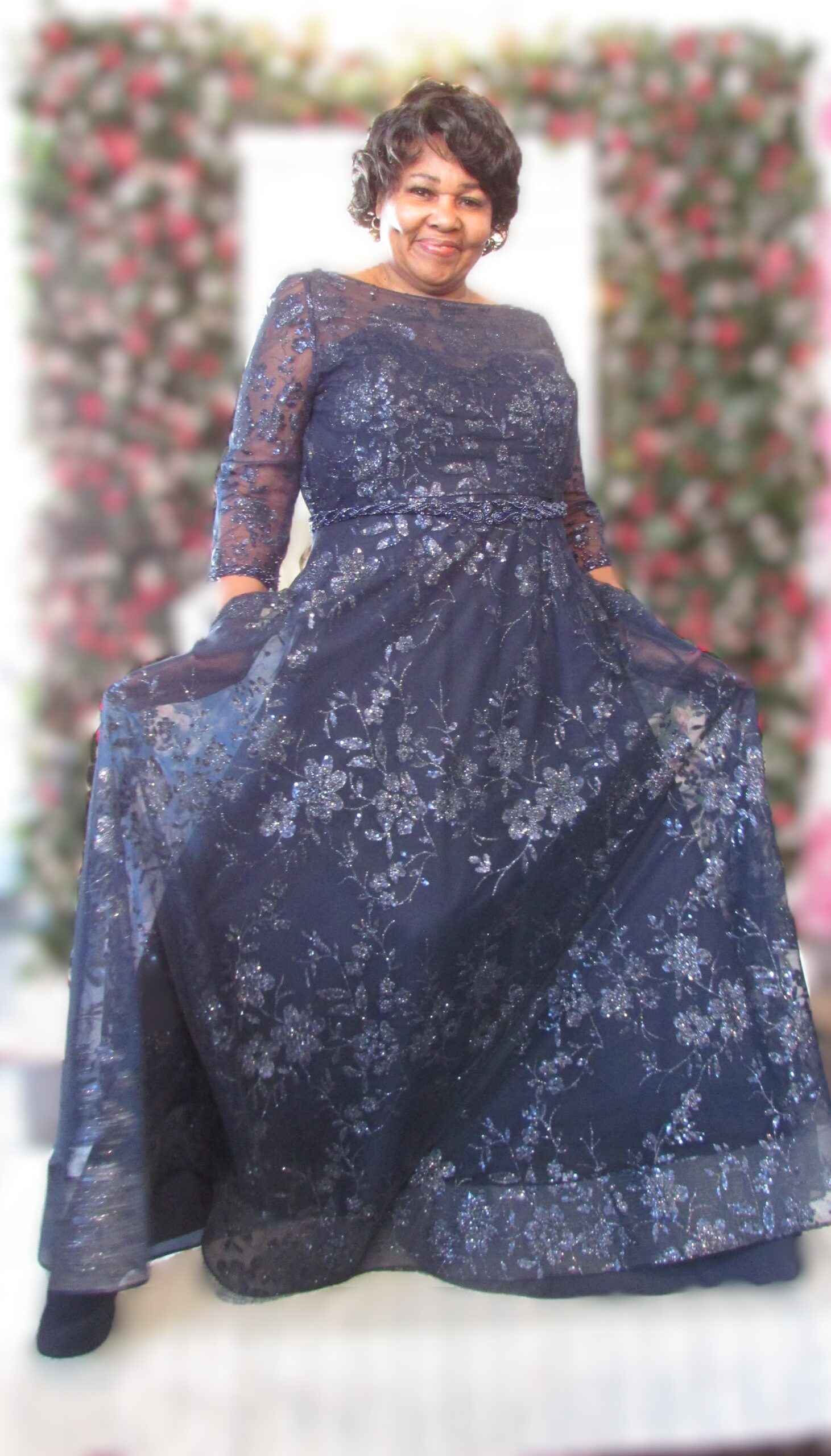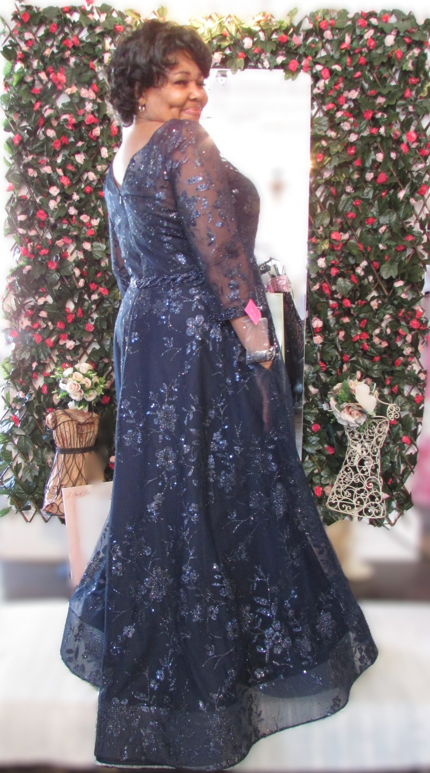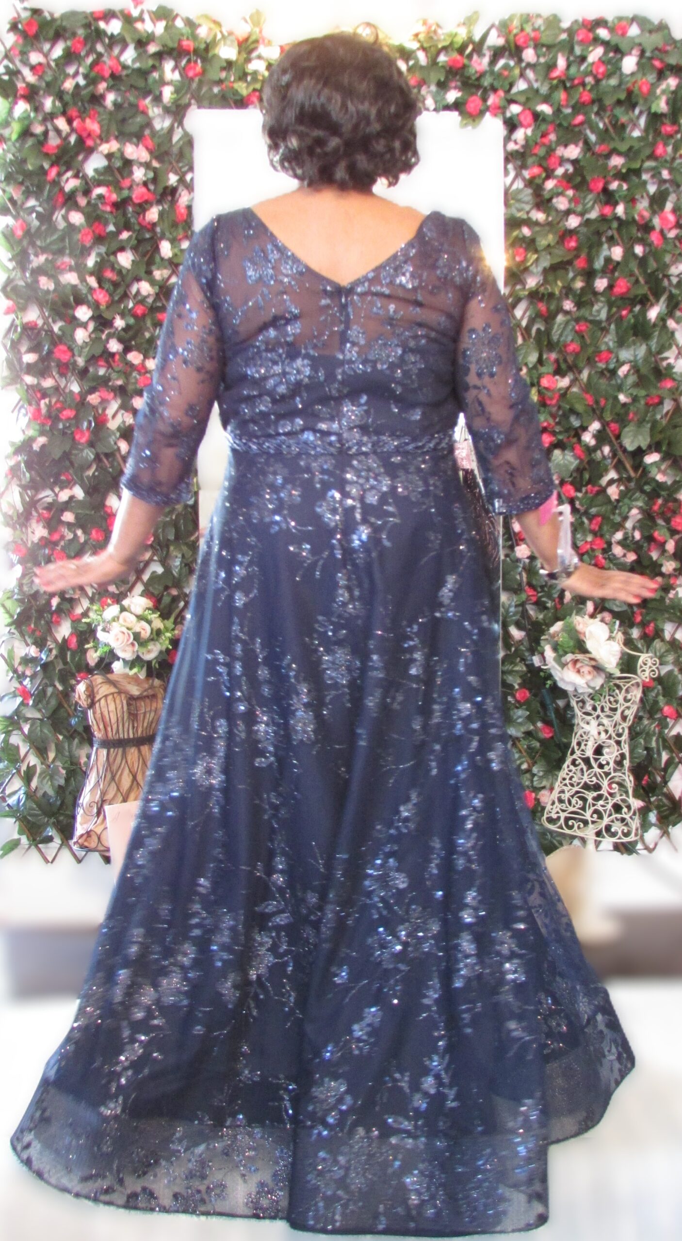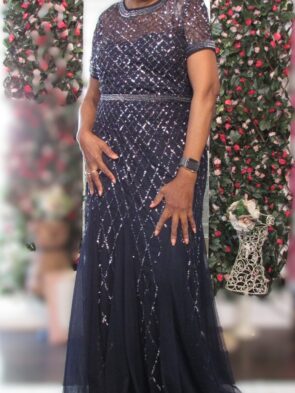 Navy w all over glitter, 3/4 sleeve, V-neck in back, Beaded belt around waist, Pockets, A-Line Flowy, Zipper back Closure, ?Your satisfaction is our #1 Concern. All our clothing is in good condition, but as most of our clothing is pre-owned, they show normal signs of wear or are in like new condition. We do look over each piece but may inevitably overlook things. If you have received your items(s) and find that there is missing information such as defect, please contact us as soon as possible.?
