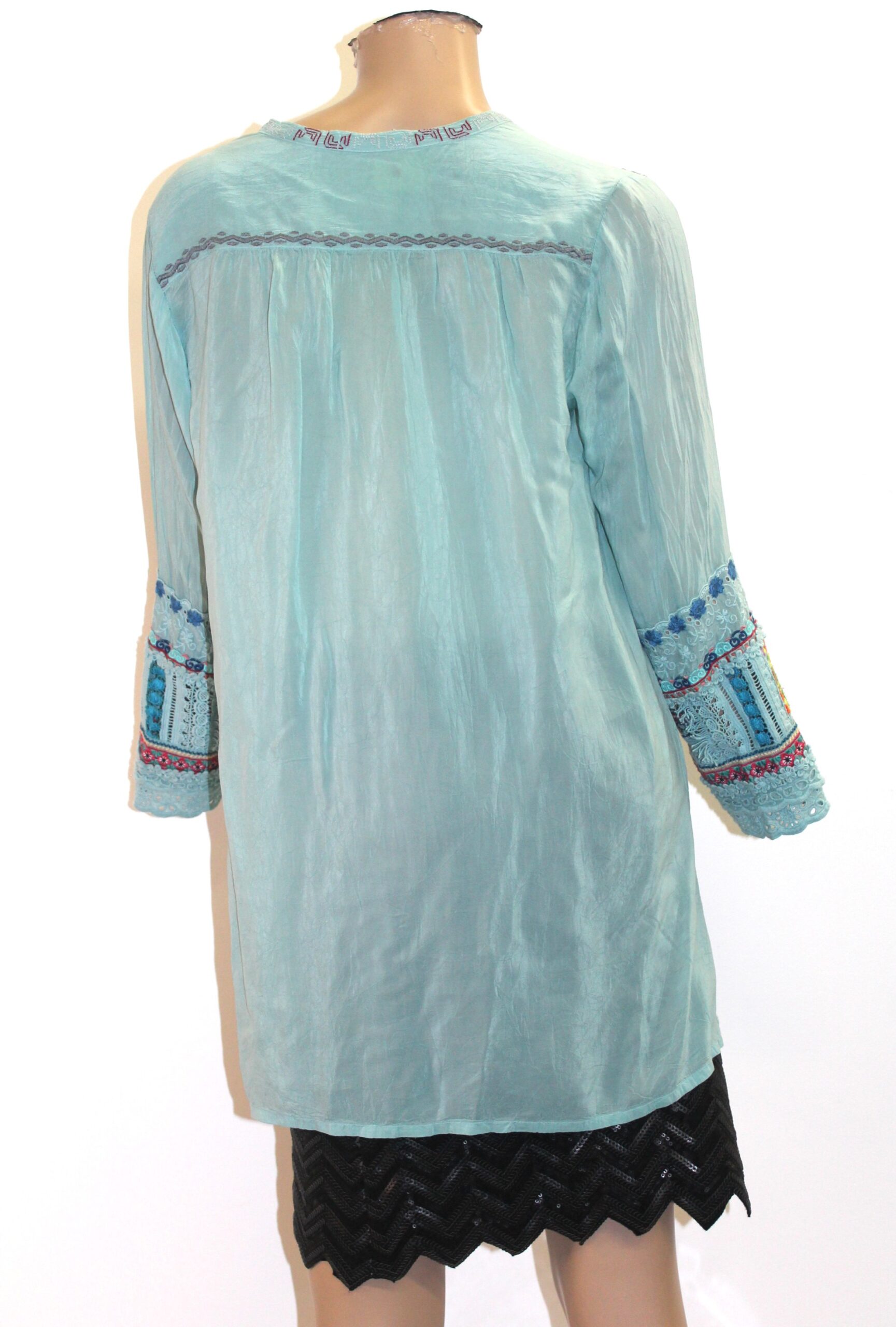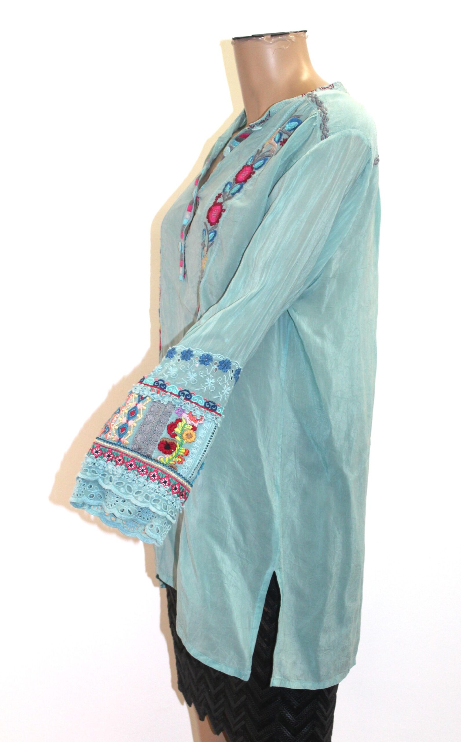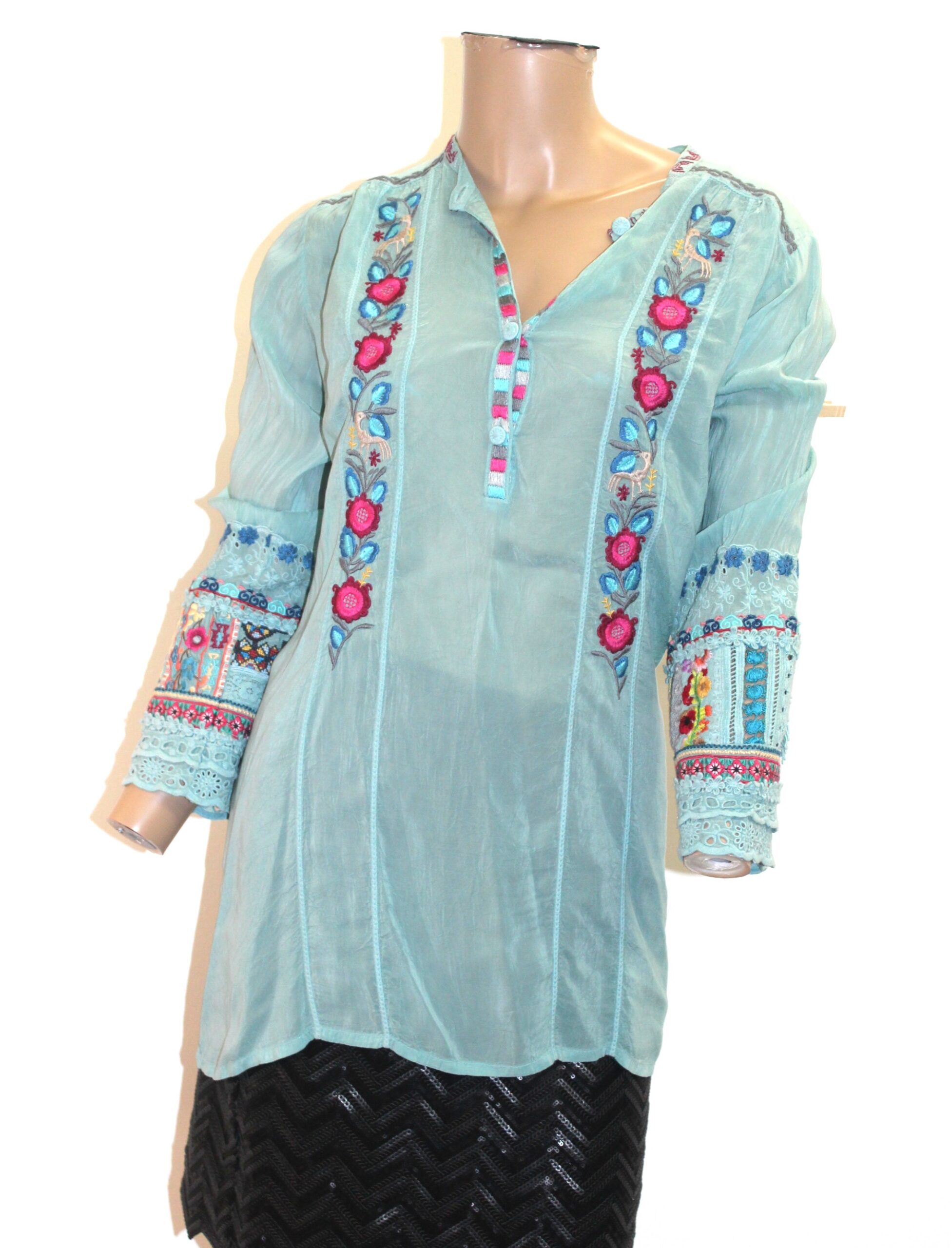 Johnny Was 100% Silk Sage Green Floral Embroidered Peasant Henley Top Size S