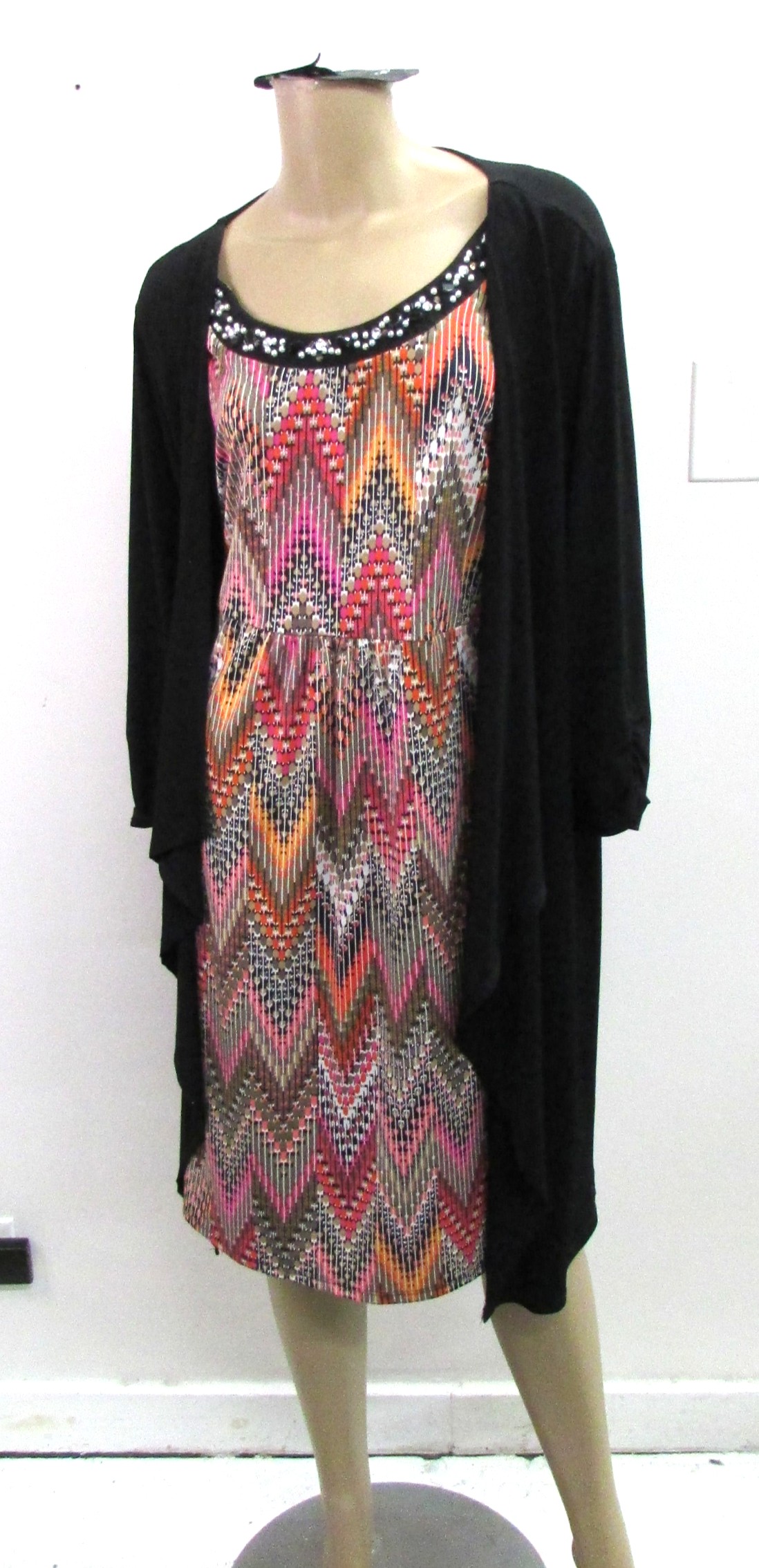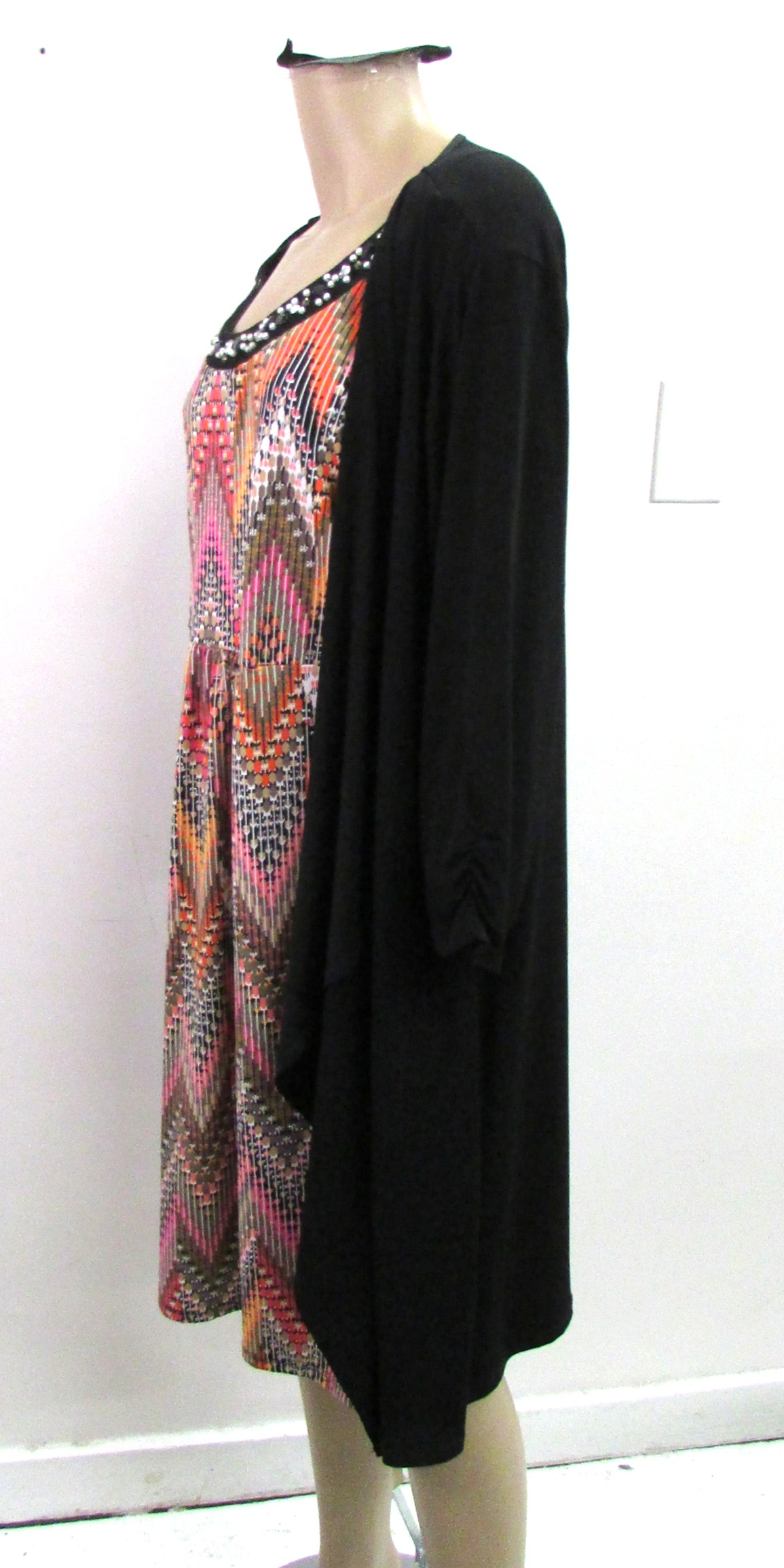 3/4 sleeve, Collarless beaded crewneck, Open face attached jacket all black w the dress multi colors