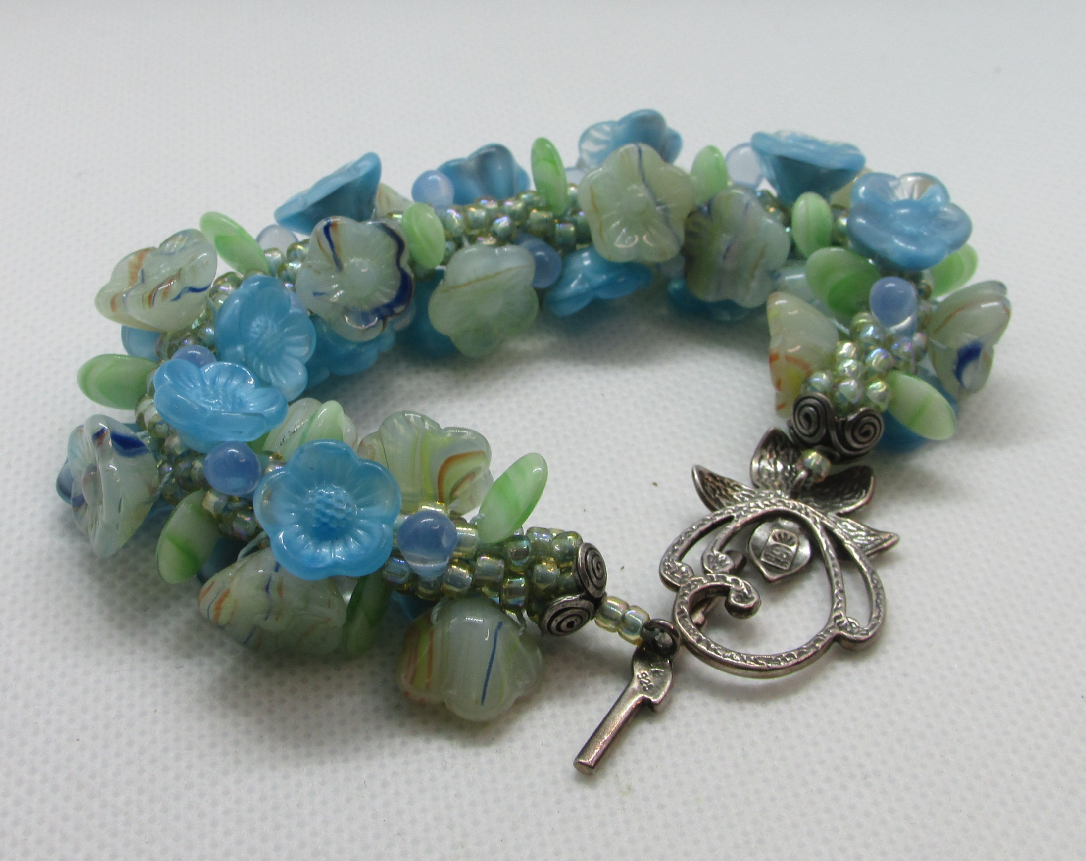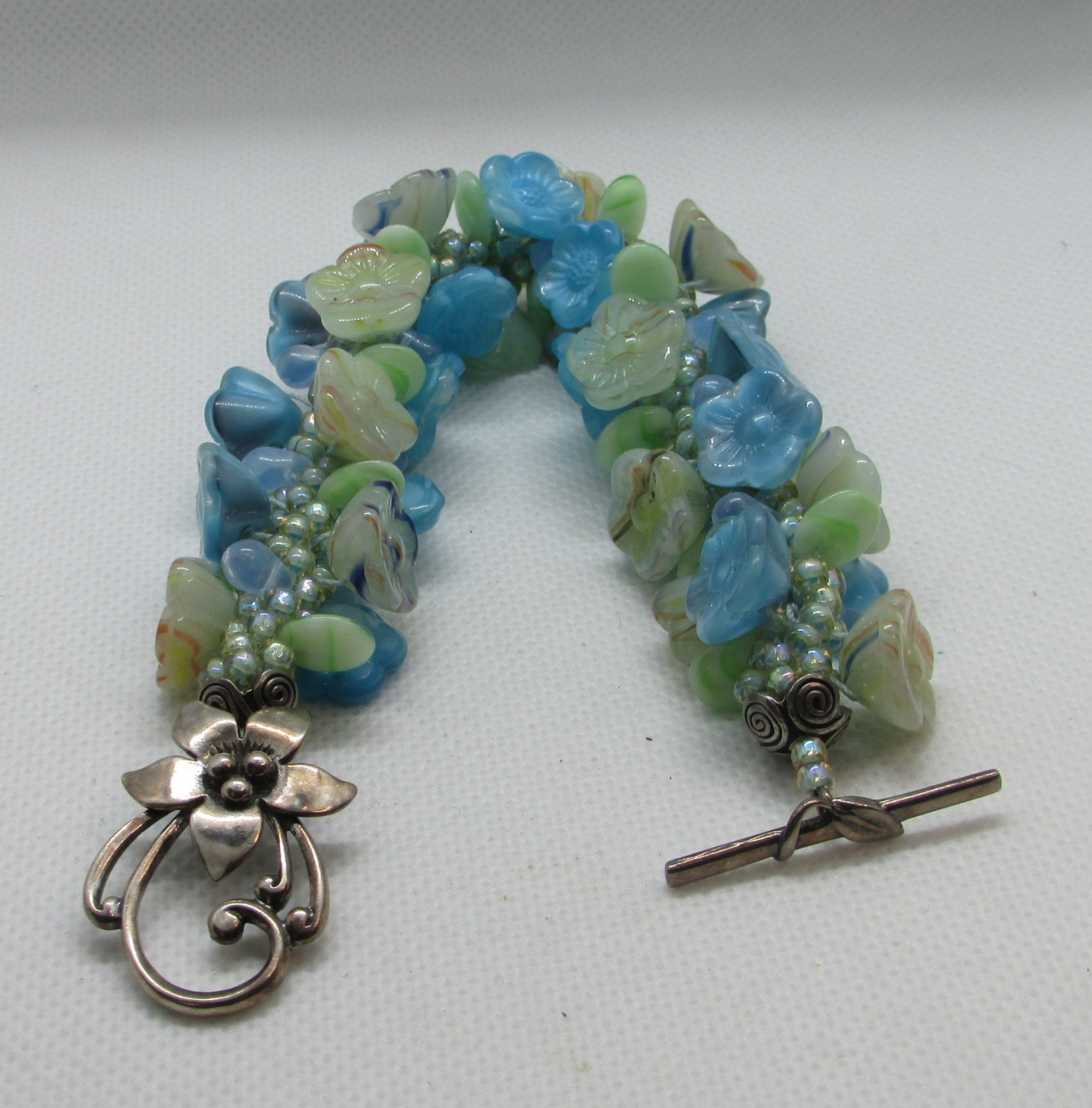 Vintage Stamped .925 Blue, Green Floral Clutter Beaded Bracelet w Toggle