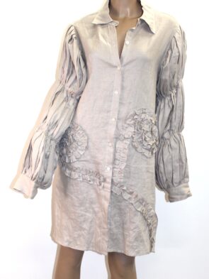 Margo Baridon Taupe 100% Linen Dress w Raised Floral and Peasant Sleeves Size M